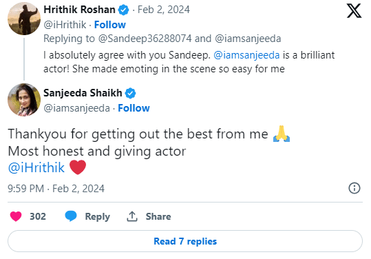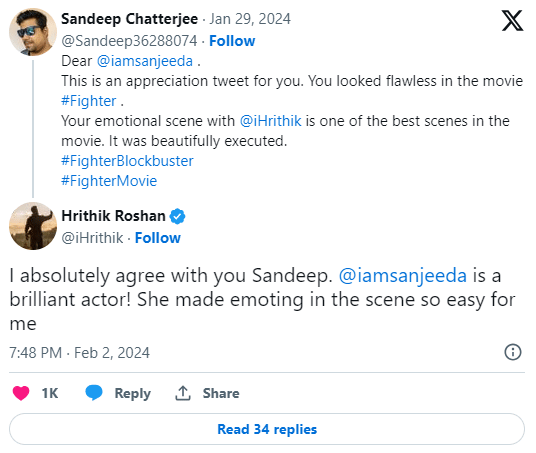 The X user's original post read, "Dear @iamsanjeeda This is an appreciation tweet for you. You looked flawless in the movie #Fighter. Your emotional scene with @iHrithik is one of the best scenes in the movie. It was beautifully executed. #FighterBlockbuster #FighterMovie" To this, Hrithik responded, "I absolutely agree with you Sandeep. @iamsanjeeda is a brilliant actor! She made emoting in the scene so easy for me" Reacting to the same, Sanjeeda wrote, "Thankyou for getting out the best from me Most honest and giving actor @iHrithik"