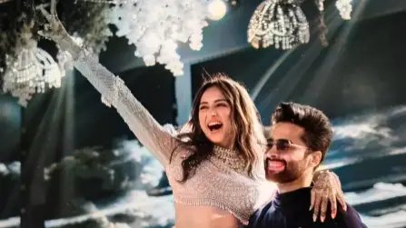 In the first photo, Jackky can be seen sweeping Rakul Preet Singh off her feet during their dance performance at sangeet. In the second photo, Rakul can be seen exuding happiness while walking with Jackky Bhagnani at the sangeet ceremony. In the third picture, the newly married couple can be seen posing together for the cameras, whereas, in the fourth photo Rakul posed solo as she shimmered in her embellished ensemble.