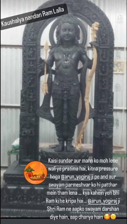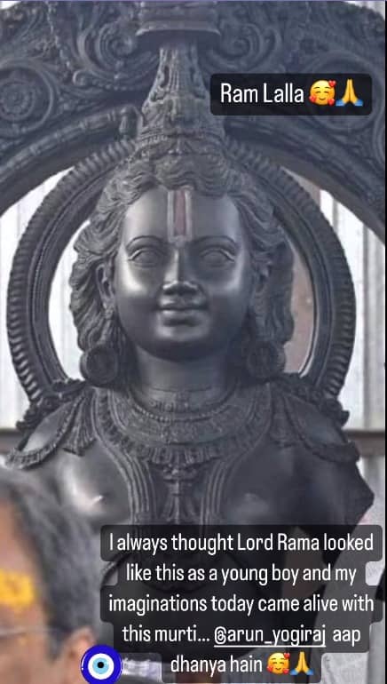 In another Instagram Story, Kangana praised Mysuru-based artist Arun Yogiraj and wrote, "Kitne sundar aur mann ko moh lene wali ye pratima hai, kitna pressure hoga @arun_yogiraj ji pe aur swayam parmeshvar ko hi patthar mein tham lena…kya kahein yeh bhi Ram ki hi kripa hai…@arun_yogiraj ji Shri Ram ne aapko swayam darshan diya hain, aap dhanya hain.”