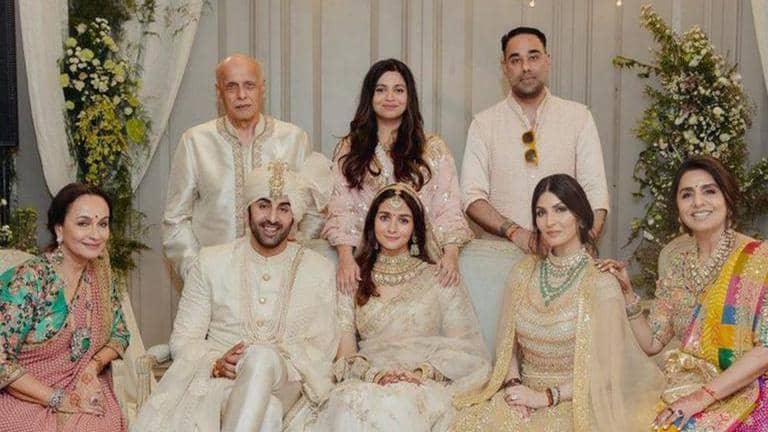 Ranbir had Alia Bhatt's father, veteran director Mahesh Bhatt, standing behind him, and his mother-in-law, actor Soni Razdan to his right, while the bride had her mother-in-law, veteran actor Neetu Kapoor and sister-in-law Riddhima Kapoor Sahni and husband Bharat Sahni to her left in the photo shared by Riddhima on Instagram. Alia's sister Shaheen too was a part of the picture as she held the Udta Punjab star between the respective families.