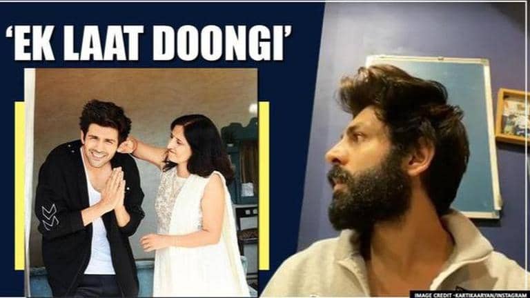 The conversation begins with Kartik's mother saying, 'Why haven't you posted any picture with me when everyone today has?'. To this, Kartik says, "I get lakhs for each post that I put up, will you give me that money?". His mother replies, "Ek Laat dungi" [Translation: Will give you a kick]