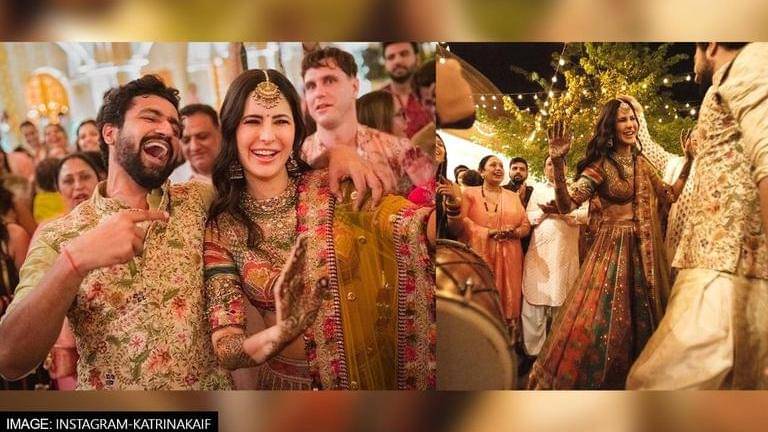 In the recently dropped pictures of the newlyweds from their grand Mehendi ceremony, the couple can be seen twinning in olive green ethnic ensembles. Katrina Kaif looked regal in a green lehenga with multi-coloured blouse. She kept her makeup to a bare minimum and opted for some heavy jewellery. In one of the pictures, the actor was also seen dancing with Vicky Kaushal's father, Shyam Kaushal.