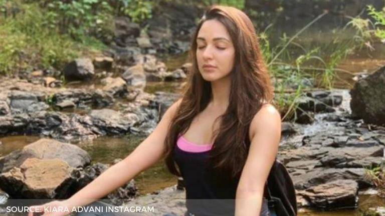 In the second Instagram post, Kiara Advani shared a picture of her meditating on the rocks. She stunned in an all-black look. She wore a black tank top paired with a pink sports bra. The top was clubbed with black yoga pants. She also carried a black backpack along with her. Kiara Advani wore a pair of blue shoes with red lace.
