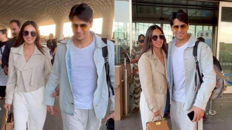 Kiara Advani was seen in a cloudy grey jacket and white trousers. Sidharth Malhotra looked cool and casual in a light blue shirt and trousers.
