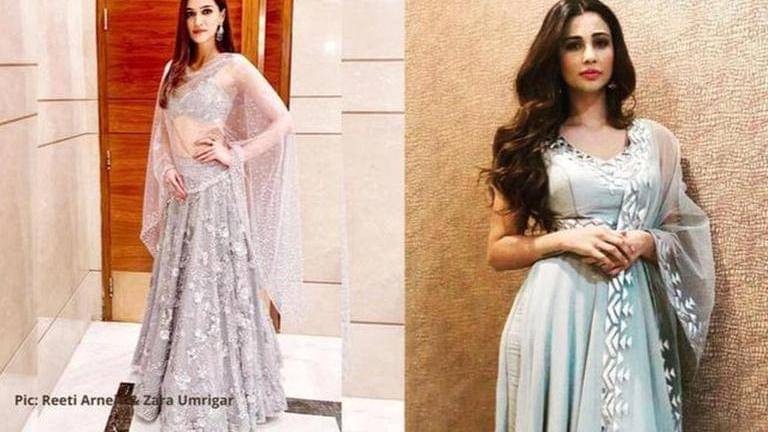 While attending her best friend’s wedding, Raabta actor Kriti Sanon was seen wearing a Zara Umrigar silver grey lehenga. Her stunning lehenga featured intricate butterfly and floral embroidery design. The design was filled with crystals. Styled by celebrity stylist Sukriti Grover, the actor teamed her attire with a matching sheer dupatta. Keeping her accessories minimal, Kriti opted for silver jhumkas. For glam, she opted for a well-defined eyes and red lips. Also, her sleek hair rounded off Kriti's look.