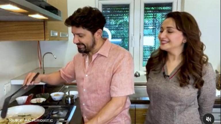 Madhuri Dixit Nene and Sriram Nene are all laughs as they make 'Sabudana Khichdi' in their kitchen. She has shared a snippet of the video on Instagram.