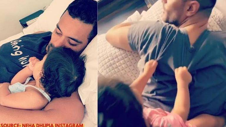 Neha Dhupia melted hearts on Instagram when she shared a video of her daughter and husband Angad. In the video, little Mehr is 'beating up' daddy Angad Bedi.