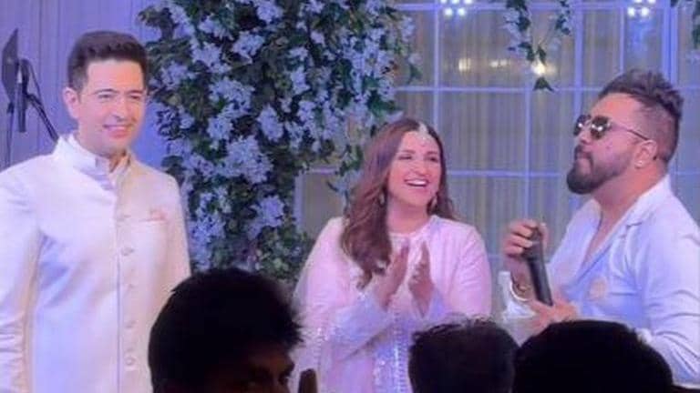 A video from the couple's intimate affair is doing the rounds on social media. In the video, Mika can be seen singing Gal Mithi Mithi Bol from the film Aisha. Parineeti and Raghav are seen grooving to his tunes. They can be seen enjoying themselves while dancing. Mika took to social media and shared the video wishing the couple. Sharing the video on Instagram, he wrote, "Bohat Sona Munda te bohat pyari kudi. Many many congratulations to bro @raghavchadha88 and dear @parineetichopra. Take a look at the screenshots from the video below: