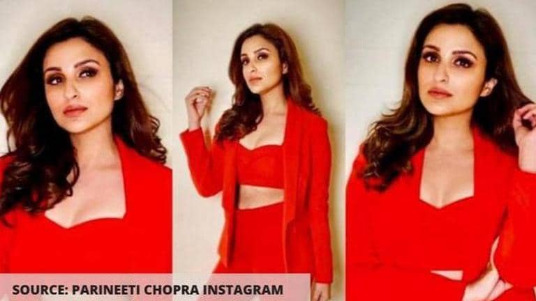 This bright red pant-suit with a bralette inside looks awesome on Parineeti