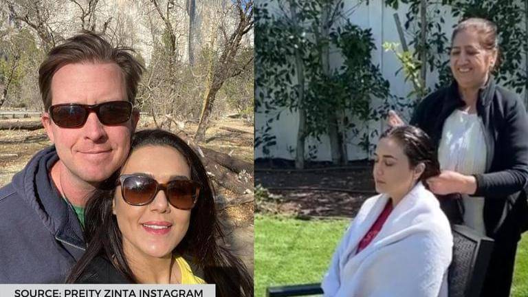 Preity Zinta recently shared a video on how she is relaxing at home. In the video, one can see Preity Zinta sitting on a chair in the veranda while her mother is seen giving her a massage. While Preity is busy enjoying her mother’s ‘champi,’ her husband, Gene Goodenough, on the other hand, is curious to know what is happening.