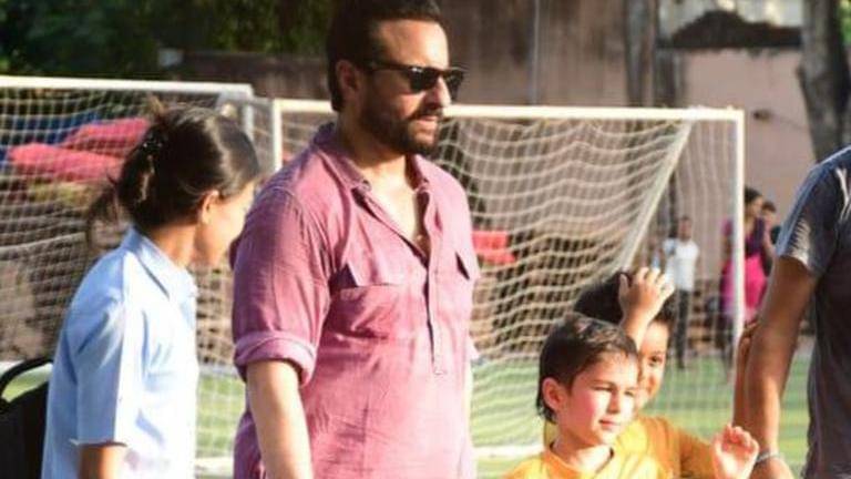 The actor was recently snapped in Mumbai along with his elder son Taimur Ali Khan. He went to pick his son up from his football practice. Saif wore a pink kurta paired with white pants. In the photos, he could be seen walking with Taimur on the ground. Take a look at the photo below.