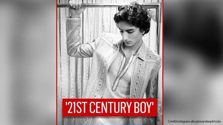 India's most coveted couturiers, Abu Jani Sandeep Khosla on Wednesday shared a stunning black and white picture of Saif Ali Khan's son Ibrahim in their traditional sherwani. "Ibrahim Ali Khan wears an off-white khadi silk sherwani with a shirt collar," they captioned the picture.