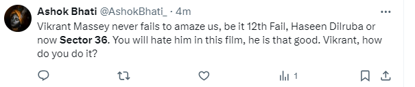 A user took to their X (formerly Twitter) account to write, “#Sector36 Review: A tough watch where Vikrant Massey and Deepak Dobriyal excel”. Another wrote, “Vikrant Massey never fails to amaze us, be it 12th Fail, Haseen Dilruba or now Sector 36. You will hate him in this film, he is that good. Vikrant, how do you do it?” Another hailed the performance of the lead stars and deemed that the film is a ‘must watch’. The comment read, “What a quality content must watch. and for both #VikrantMassey and #DeepakDobriyal performance.”
