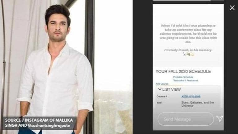 Sharing a screenshot of her upcoming Astronomy course, Mallika Singh recalled telling Sushant that she was planning to take up an Astronomy course for her science requirement. She revealed that he told her he would sneak into her class with her. Singh further wrote, "I'll study it well, in his memory".