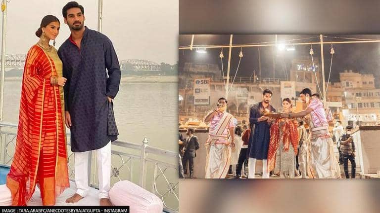 Ahead of the highly anticipated film 'Tadap', the lead stars Ahan Shetty and Tara Sutaria visited Varanasi to perform the famous Ganga Aarti.