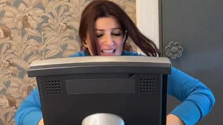 Twinkle Khanna seemed to be singing with all her passion as she crooned the lyrics of Easy on Me, 'go easy on me, baby'. However, as the camera pans, she taps the screen of the treadmill bicycle to go easy on her. She then continued the lyrics, 'I was still a child, Didn't get the chance to feel...' as she pedalled her way with some effort.
