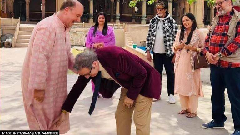 In the picture, while Sarika, Amitabh Bachchan, Neena Gupta, and Boman Irani look on, Anupam bends down to touch Raju Kher's feet. Anupam is dressed up and wearing a wig, while Raju is dressed in a kurta-pyjama.