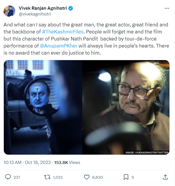 Sharing the photos he wrote, “And what can I say about the great man, the great actor, great friend and the backbone of #TheKashmirFiles. People will forget me and the film but this character of Pushkar Nath Pandit backed by tour-de-force performance of @AnupamPKher will always live in people’s hearts.” He concluded the note by asserting that the actor’s performance will be cherished and he does not need an award to prove his merit. The director wrote, “There is no award that can ever do justice to him.”