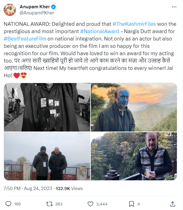 Following the 69th National Awards ceremony held in the national capital, director Vivek Agnihotri took to his social media to pen a note for his win. His film The Kashmir Files was honoured with the Nargis Dutt Award for Best Feature Film. After expressing his gratitude to the jury and audience for the honour, the director took to X (formerly Twitter), to share stills of Anupam Kher from the film.