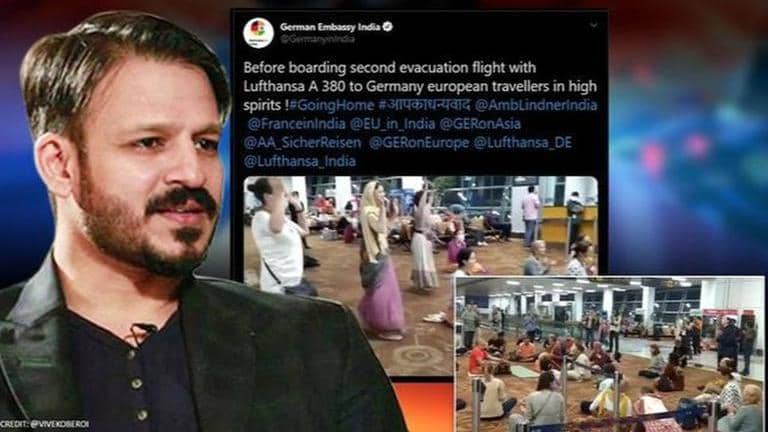 Bollywood actor Vivek Oberoi shared a video of european travellers chanting 'Hare Rama Hare Krishna' at Indira Gandhi Airport in New Delhi. German Embassy India confirmed saying, "Before boarding second evacuation flight with Lufthansa A 380 to Germany european travellers in high spirits!" followed by hashtags 'Going Home' and 'Aapka Dhanyawad'.