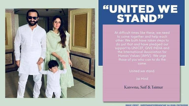 Joining the Bollywood bandwagon to contribute to those in dire need of livelihood supplies and essentials for survival, Begum of Bollywood Kareena Kapoor, along with her husband actor Saif Ali Khan, has pledged her support for them. The Jab We Met actor took to Instagram and posted a note declaring her contribution to the relief funds set by UNICEF, GIVE INDIA and International Association for Human Values (IAHV). The note has been signed as 'Kareena, Saif and Taimur' as they pledge to stand united to lend a helping hand during the crisis.