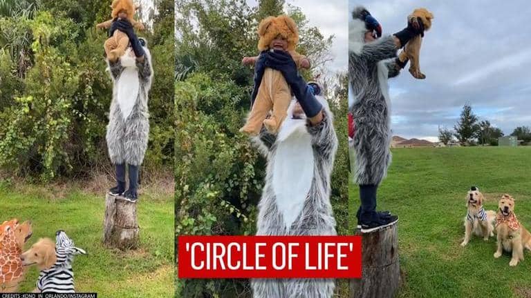The internet is flooded with people making an attempt to recreate the well-known scene from Simba’s introduction from Lion King. A recent Instagram video, however, is one of the many cutest recreations that includes two dogs, a dad and his lovely baby daughter. Shared by profile Kono and Kenai, the video shows dad Jeremy dressed up like Rafiki and his daughter Malia wearing a lion costume.