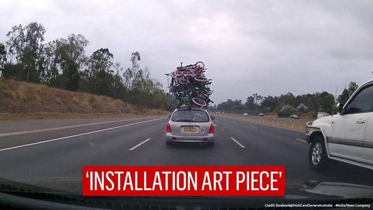 In a one-of-a-kind sighting in Australia, a car's dashcam captured another four-wheeler that was carrying a 'mountain' of bikes on its roof and is now being called as the 'installation art piece' by internet users. As per the social media posts, the footage is from Australia Eastern Creek, New South Wales. The screengrab from the video was posted on the Facebook page of 'Dash Cam Owners Australia with the image being a part of Dash Cam Owners Australia's 'She'll Be right mate', album. The caption, along with the image that was shared last week said, “Getting all the kids bikes in the car for the Holiday season is becoming a challenge.”
