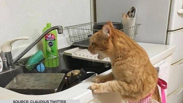 Apron-clad cat screaming at sink full of dishes makes Twitter go ROFL