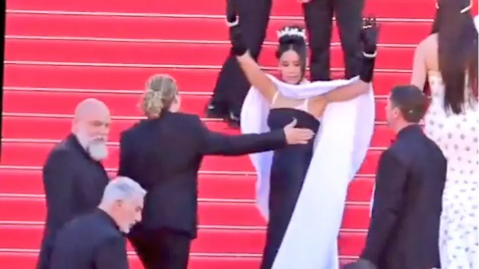 In the widely circulated video, Taveras is seen ascending the iconic red steps of Cannes in a black gown with a white cape, featuring a dramatically long trail ending with a picture of Jesus. However, the guards and organizers at Cannes prevented her from posing on the stairs, instead insisting she enter the theatre.
