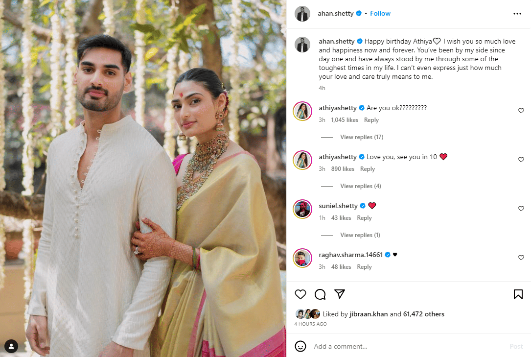 While Ahan's post was all-heart and carried a certain poignancy, Athiya took the opportunity to slightly pull her brother's leg. The actress was quick to comment a "Are you ok?????????" under the picture shared by Ahan. The comment reflects the warm camaraderie shared by the Shetty siblings. Suniel Shetty also shared a red heart emoji acknowledging the post.