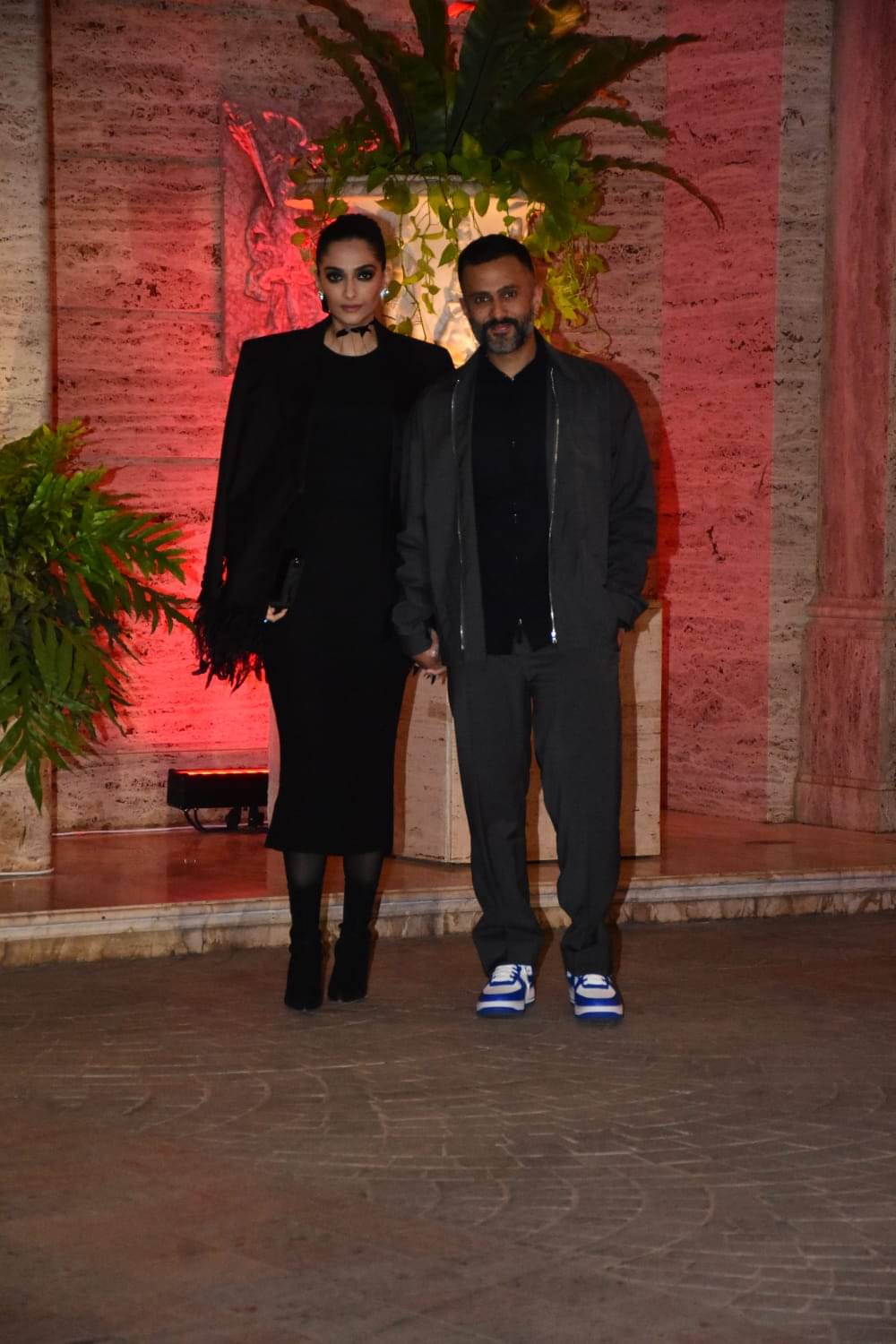 Sonam Kapoor's appearance for the intimate bash featured her in a fitted midi. The dress was paired with a casually taken jacket with exaggerated ostrich-feather hemmed cuffs. Sonam's makeup mirrored her look as the actress sported smoky black eyes. Anand too opted for a sombre colour palette, donning an olive brown co-ord set. Malaika on the other hand opted for a three-piece denim co-ord set - the highlight of the set was an all-white mid-length denim jacket.
