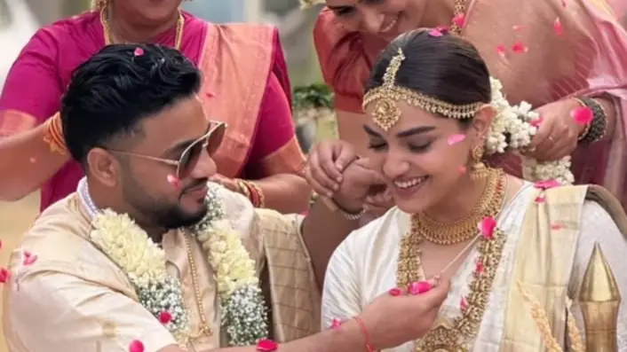 An X (formerly Twitter) user posted a photo from Raftaar and Manraj Jawanda's wedding. The couple, married in a South Indian ceremony, wore elegant traditional attire and smiled warmly at each other. Alongside the picture, the user wrote, "So cute!! Nazar na lage Congratulations, Raftaar." Another image showed the rapper tying the mangalsutra around Manraj's neck.