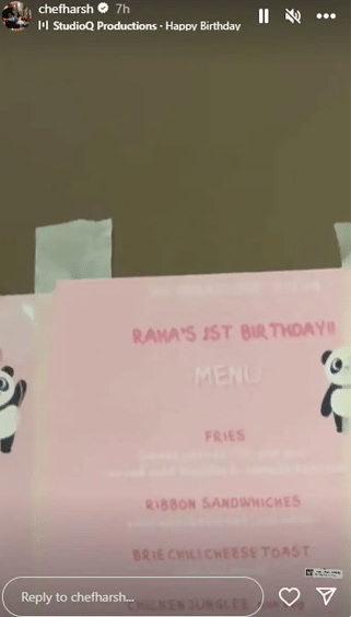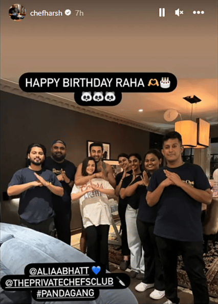 The delicacies served at Raha Kapoor''s first birthday celebrations were catered by Chef Harsh who runs the Private Chefs Club. The exclusive service is open only through referrals and not for the general public. Raha Kapoor's birthday then surely made the cut. A picture shows Alia Bhatt and Ranbir Kapoor standing among the 'panda gang' striking their signature move after a successful night.