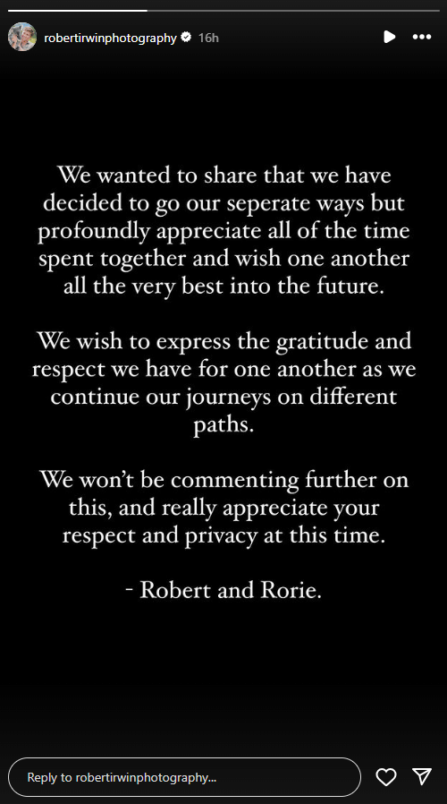 Robert Irwin and Rorie Buckey announce their split
