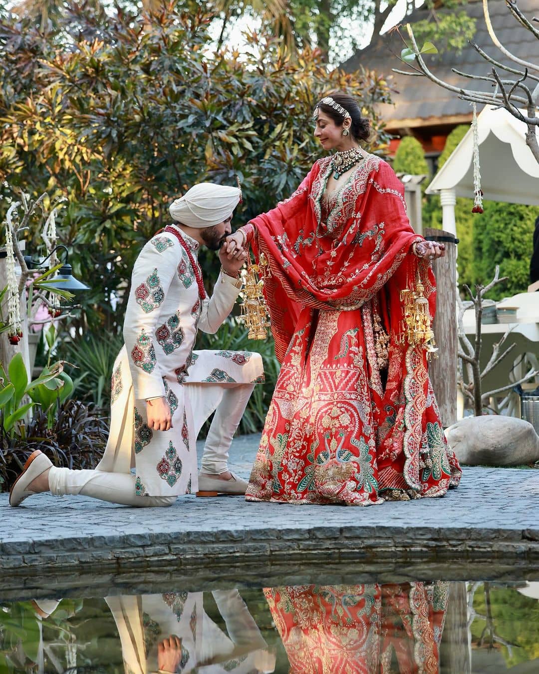 Sukhmani Sadana and Sunny Gill tied the knot on March 3, 2024. The duo took to their Instagram handles to make a joint post, sharing pictures from their nuptials. While Sukhmani opted for a traditional Rimple and Harpreet red and golden sharara set with an emerald and polki jewelry set, Sunny looked dapper in an embroidered white bandhgala with a matching turban.