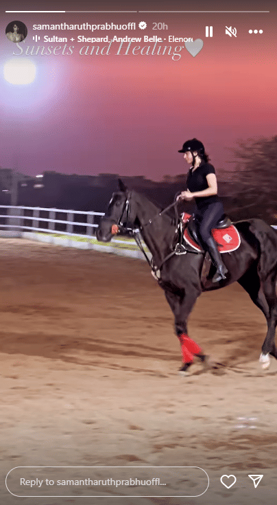 Samantha Ruth Prabhu recently took to her Instagram stories to share a short video of herself in what appears to be her latest stop in her quest for healing. The actress can be seen taking, what appears to be a horse riding lesson. The actress is dressed in all-black athletic casuals paired with a safety helmet as she carefully maneuvers the horse around the compound.
