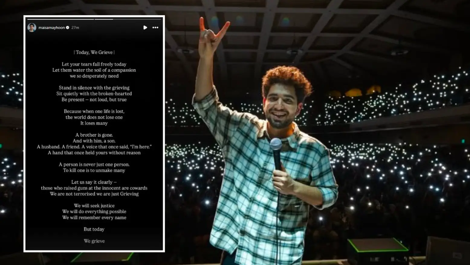 On April 22, on the day when a deadly terror attack claimed the lives of 26 tourists in Pahalgam, Samay Raina shared a post with the caption, “Unable to sleep tonight”. The next day, the comedian, who hails from Jammu & Kashmir, penned a note on grief. In his post, the actor wrote, "| Today, We Grieve | Let your tears fall freely today Let them water the soil of a compassion we so desperately need Stand in silence with the grieving Sit quietly with the broken-hearted Be present-not loud, but true. Because when one life is lost, the world does not lose one It loses many. A brother is gone. And with him, a son. A husband. A friend. A voice that once said, “I'm here.” A hand that once held yours without reason. A person is never just one person. To kill one is to unmake many. Let us say it clearly -those who raised guns at the innocent are cowards We are not terrorised we are just Grieving. We will seek justice We will do everything possible We will remember every name. But today. We grieve."