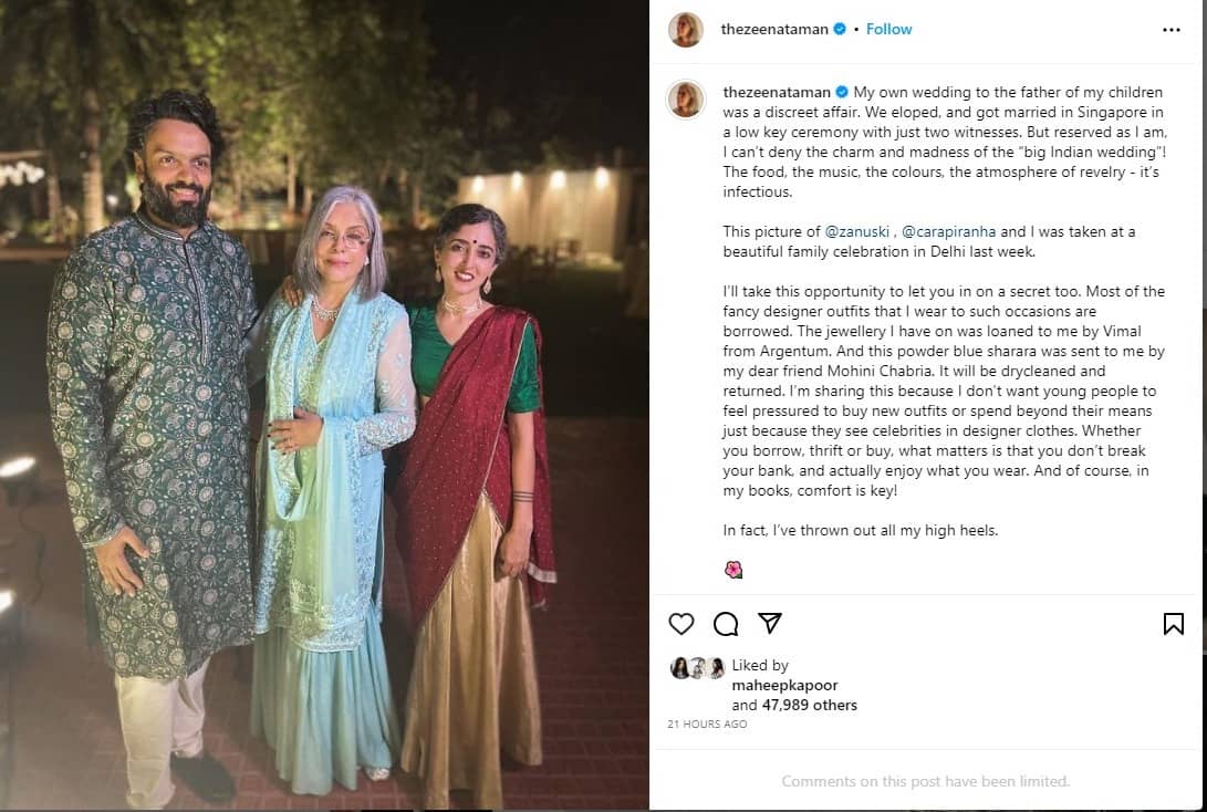 In the same post, Zeenat insisted that she always prefers to wear outfits that don't ‘break the bank’ and that one enjoys. She mentioned, “Whether you borrow, thrift, or buy, what matters is that you don’t break your bank, and actually enjoy what you wear. And of course, in my books, comfort is key!” Citing examples of how she chooses comfort over fashion she mentioned, “In fact, I’ve thrown out all my high heels.”