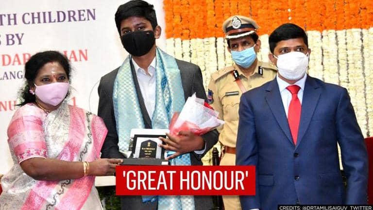 Twitter handle named Dr Tamilisai Soundararjan shared an image of the 13-year-old boy receiving the award. In the caption, the uploader wrote, “Raj Bhavan Felicitated the young prodigy Hemesh Chadalavada for getting Pradhan Mantri Rashtriya Bal Puraskar Award. The 13-year-old innovator from Telangana has developed a ‘Smart Wristband’ to monitor elderly and disabled particularly the persons suffering from Alzheimer's".Talking about his journey, Hemesh said, “I first used to make small robots and cars and then started recognizing problems in our daily life. So I started to make innovations which would help the country”.