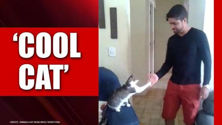 While videos of dogs giving high five and fist bumps have surfaced several times on the internet, recently, a video of ‘cool cat’ has caught netizens attention. A clip shared on Reddit shows a cat sitting on the arm of a sofa waiting for its owner to walk by. Seconds later, when the human walks by, extending his hand, the kitty surprisingly gives a high five followed by a quick fist-paw bump.