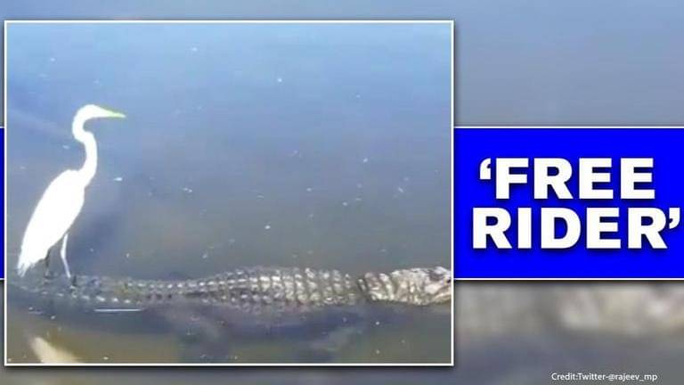 A brave Crane risks its life by hitching a ride on the back of a crocodile and doesn’t even seem to be fazed by its potentially dangerous transportation. While keeping it cool, the crane stands on the reptile's tail and maintains its stance as the crocodile swims in the water. Shared on May 24, by BJP MP Rajeev Chandrasekhar on Twitter with a caption ‘Hitching a ride’ has now taken the internet by storm.