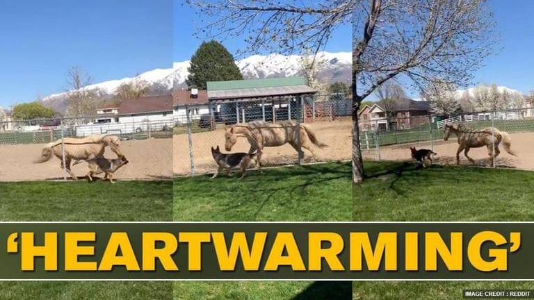A video of a dog and a horse happily running around and playing has left several internet users heart-warmed. Shared on Reddit on June 21, the short clip shows a German Shepherd interacting with a white coloured horse in a park. While the horse can be seen standing behind a fence, the video captures the duo running from one end of the enclosure to the other.
