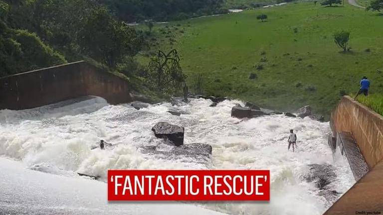 The whole rescue mission was recorded by James wife, Stella, who then shared the video on social media. The five-minute clip shows the dog being washed down the causeway below the dam wall. Ndlovu can be seen holding a rope anchored by James on the ban nearby. Carefully and bravely, Ndlovu then can be seen making his way steadily to the rock in the middle of the strong-flowing stream. He climbs onto the rocks and manages to reach over to where the scared pooch waits, picking it up and cradling it in his arms to negotiate his way through the water to dry land.