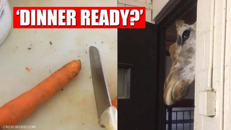 A video of a giraffe gawping at his meal from the vicinity of the kitchen from a window has caught the attention of the internet users. Shared on Reddit on June 1 under the subreddit ‘funny’, the clip, captioned as “Dinner ready?” featured a “hungry” Giraffe ogling at the carrots ready to be chopped at the kitchen worktop. However, he is caught staring as he immediately feels embarrassed and pretends to look away.