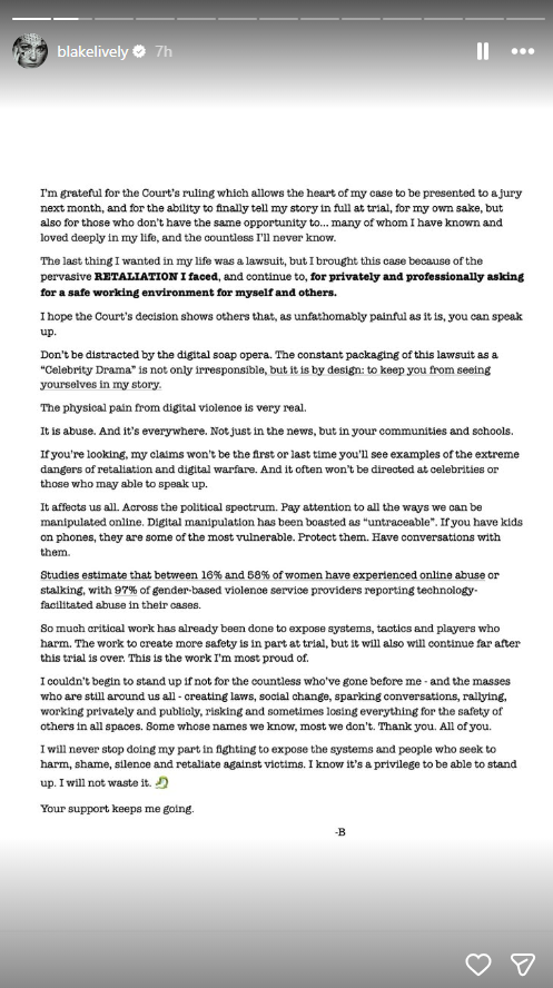 In a statement shared on her Instagram Stories, Lively said she remains committed to pursuing justice, with the case now set to go to trial in New York on May 18.