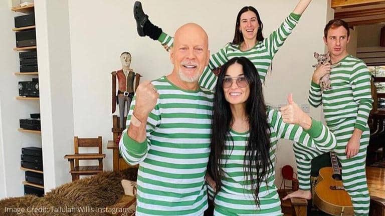Bruce Willis and Demi Moore’s youngest daughter, Tallulah Willis took to her Instagram to share a picture in which the family can be seen smiling for the cameras in matching outfits. In the pictures, Bruce Willis and Demi Moore can be seen wearing matching green striped pyjamas and long-sleeved t-shirts. Their other daughter Scout can also be seen in the picture at the back with film director Dillon Buss. Tallulah captioned the picture as ‘Chaotic neutral’.
