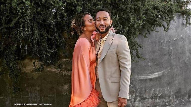 John Legend recently posted a picture of him with his lady love Chrissy Teigen. In the picture, the duo is all dressed and Chrissy Teigen is seen kissing John while he strikes a wide smile for the picture. Chrissy Teigen is seen all glammed up in an orange satin-finish complemented with a feathered trim. Her dress was paired with glam makeup and stilettos.