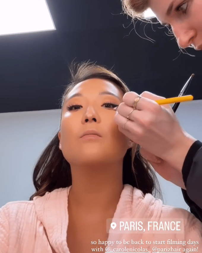 Ashley Park Lady took to her Instagram stories to share a short video of herself getting her hair and makeup done, in her vanity van. The caption to her video, which shows her dressed in a fluffy pink robe and a half-up half-down hairdo, read, "so happy to be back to start filming days with @_carolenicolas_, @parizhair again! @emilyinparis"