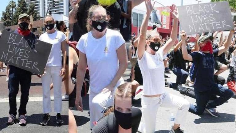 The actors were spotted taking a knee during a peaceful demonstration. While Knight held up a 'Black Lives Matter' sign, Pompeo joined the crowd by raising her hands as they demonstrated the "don't shoot" pose.