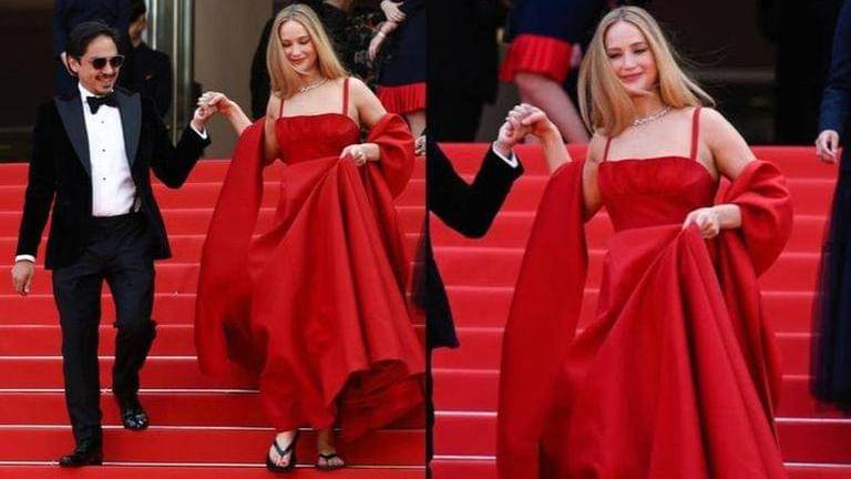 Jennifer Lawrence created much buzz on the internet during Cannes 2023, when she was snapped walking down outside the venue in flip-flops and a bright red Dior gown. Soon after her pictures went viral on social media, netizens speculated that she was making a ‘political statement’. Now, the actress has cleared the air around her viral photo, saying that she had no idea it would create such a furore.
